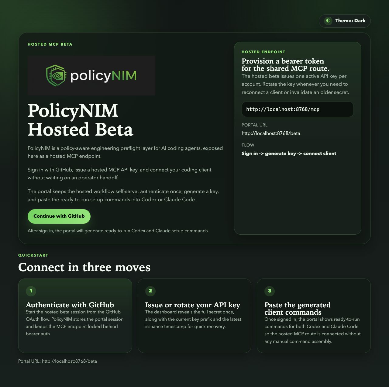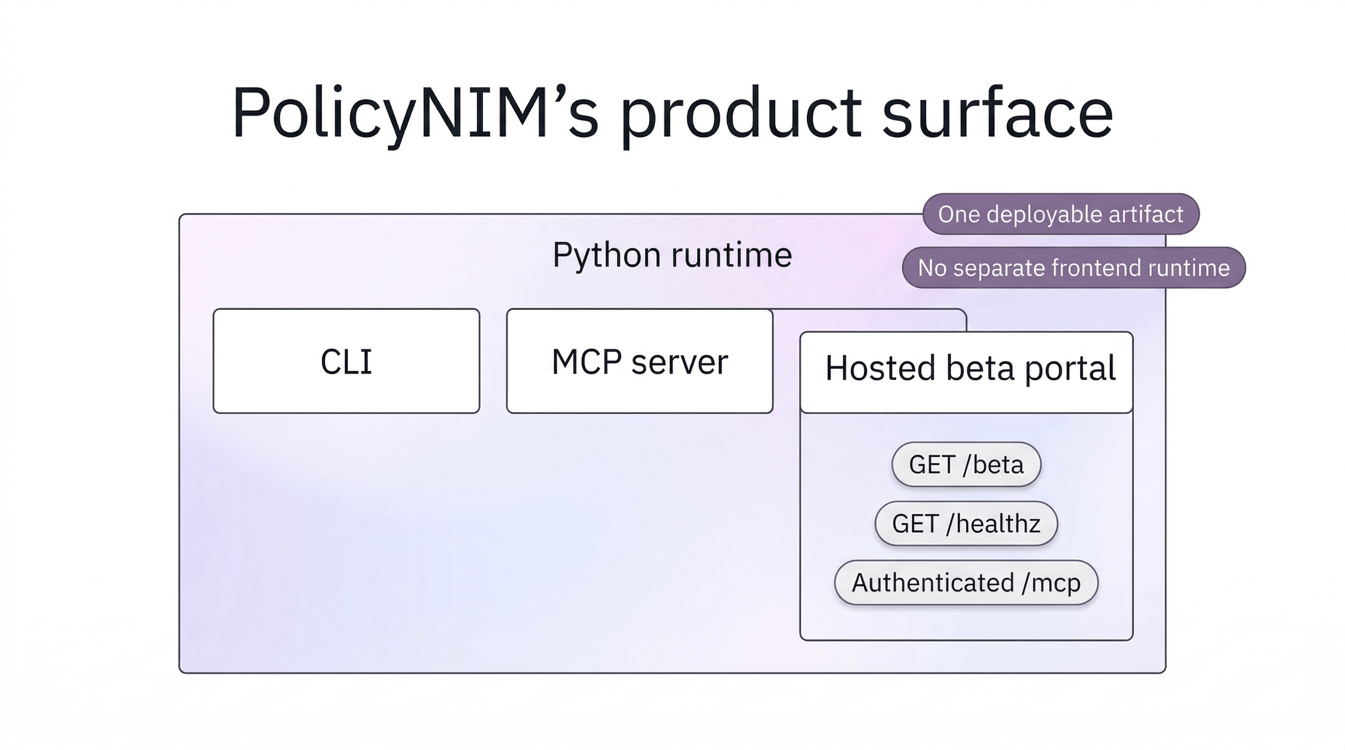 "src/policynim/templates" = "policynim/templates"That is operationally boring in the best way. One artifact. One runtime. One place to debug packaging problems. The same hosted interface layer that serves authenticated /mcp and GET /healthz also serves GET /beta, so I do not need a separate frontend deploy contract just to support the hosted beta portal.