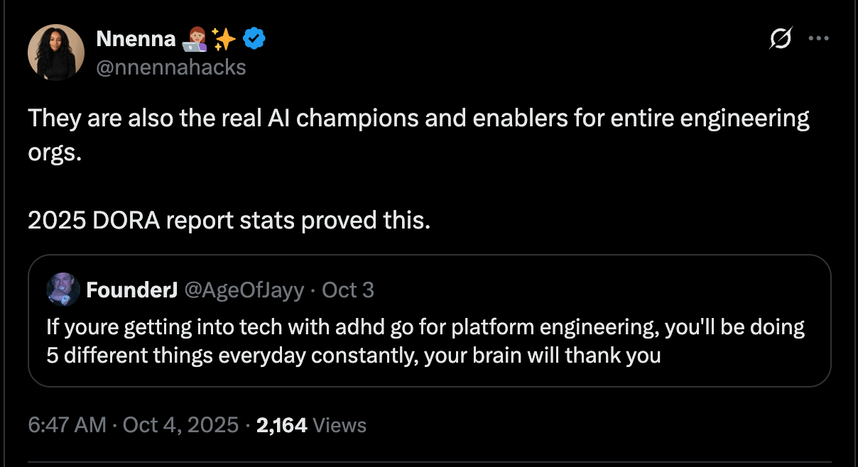 If you’re curious about getting into platform engineering, now might be the perfect time. They’re building the blueprint for AI success and their work is directly tied to business impact, something that keeps them valuable in organizations in a time where instability in tech has become far too normal.