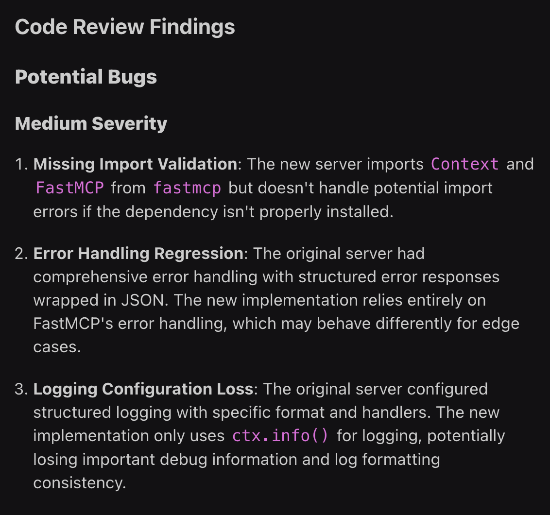 A /review workflow output on your local machine, prior to making an official pull request for other engineers to review.